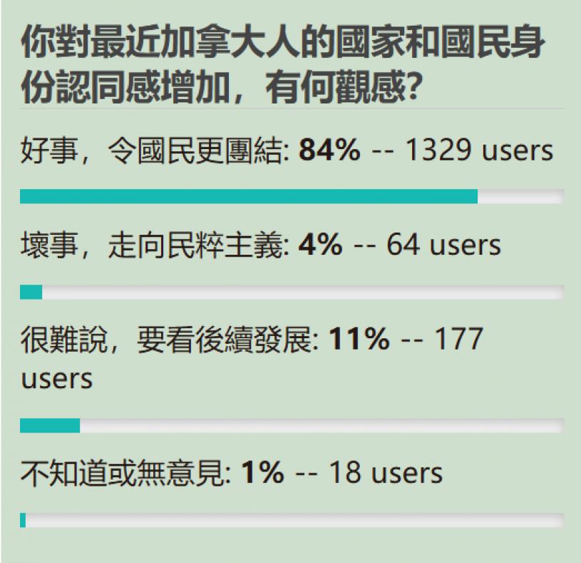 84%的受访者认为加拿大人增强了对国家和国民身份的认同感是好事,有助国民更团结。相比之下,只有4%的人担心这可能导向民粹主义。