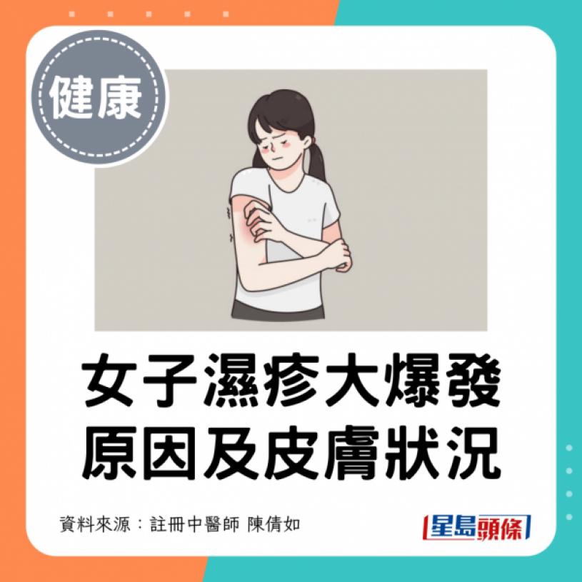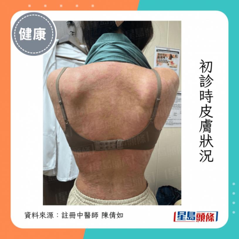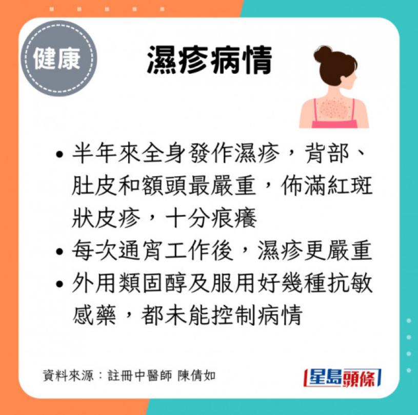 註冊中醫師陳倩如分享病例指,該名女病人自小就有濕疹,長大後症狀逐漸能控制,不會影響生活。然而,隨著近年開始通宵工作,這半年來她全身發作濕疹,當中以背部、肚皮、額頭最為嚴重,遍布紅斑狀皮疹,十分痕癢。每次通宵工作後,她的濕疹病情都會加重,即使外用類固醇及服用好幾種抗敏感藥,都未能控制病情。