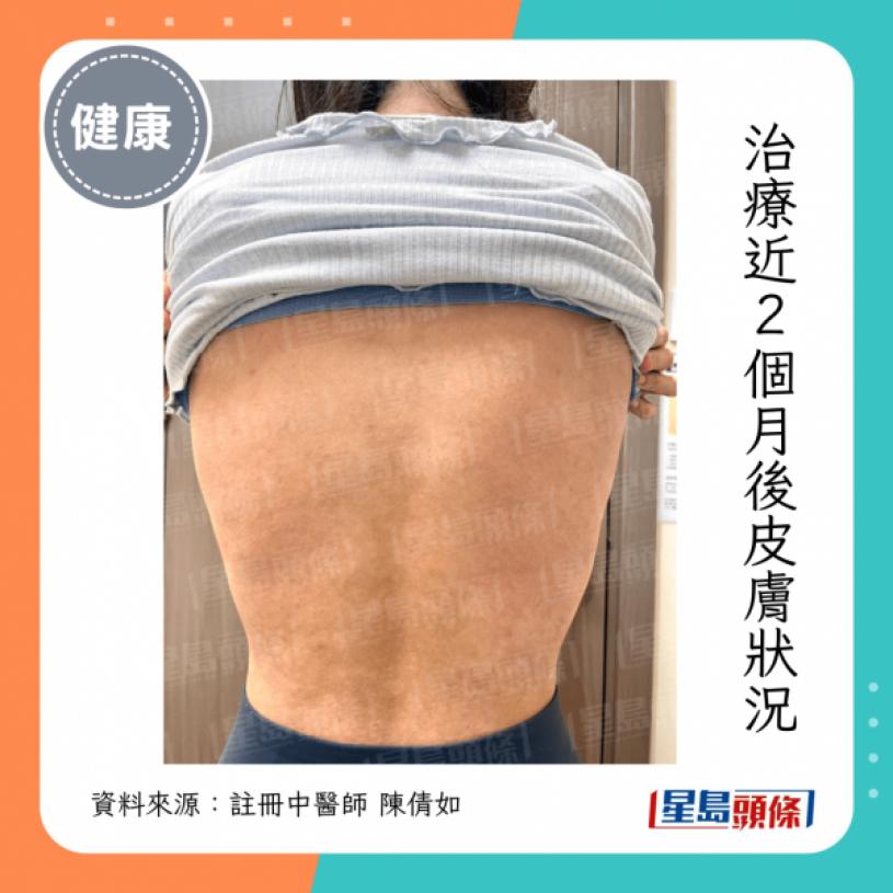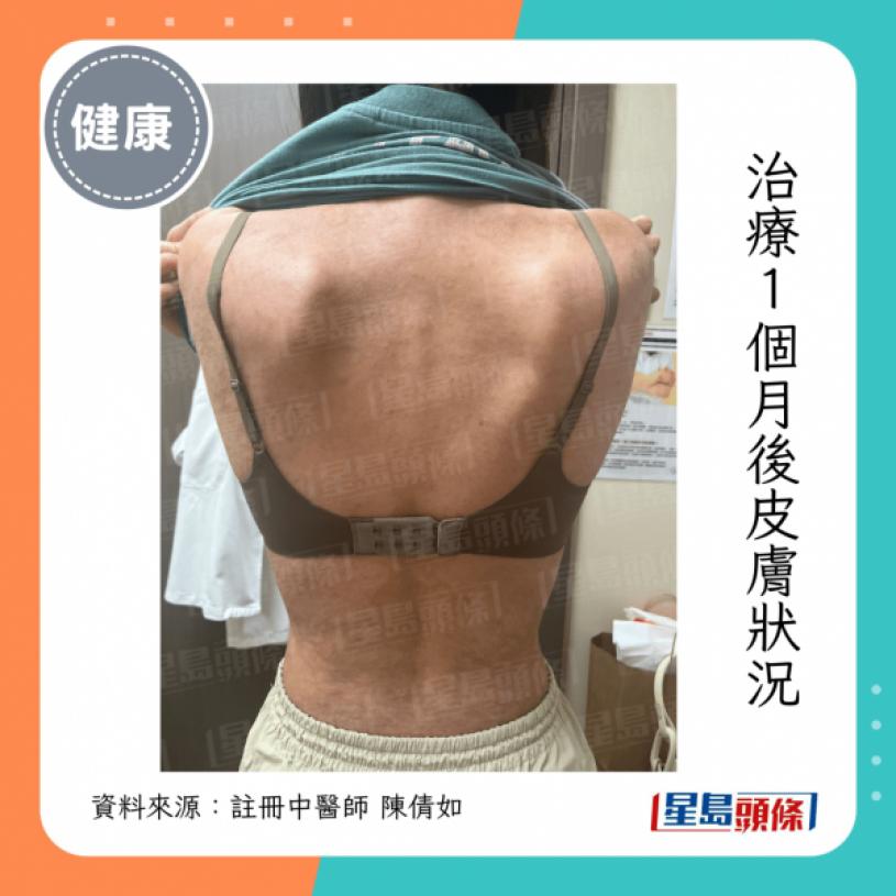 - 陸續治療1個多月,病人回診時非常高興,現時背部紅疹已消退大部分,只剩下印痕,皮膚亦回復光滑,軀幹完全不癢,可以一覺睡到自然醒。平時也有做運動,現在能正常出汗,不怎麼怕冷。