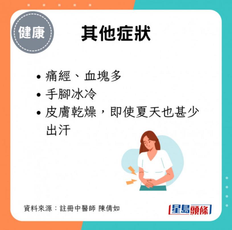 除了濕疹,該女病人也有痛經、血塊多的問題,而且手腳冰冷,皮膚乾燥,即使夏天也甚少出汗。