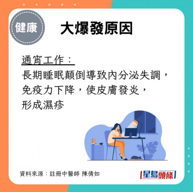 陳倩如醫師判斷,這次濕疹爆發與女病人通宵工作有密切關係。她解釋指,人體的生理時鐘(晝夜節律)與外界環境變化相應,所以古人有「日出而作,日入而息」之說。偶然一次熬夜,都會帶來頭痛、頭暈、食慾不振等短暫副作用;長期睡眠顛倒,更會導致內分泌失調,免疫力下降,使皮膚發炎,形成濕疹。