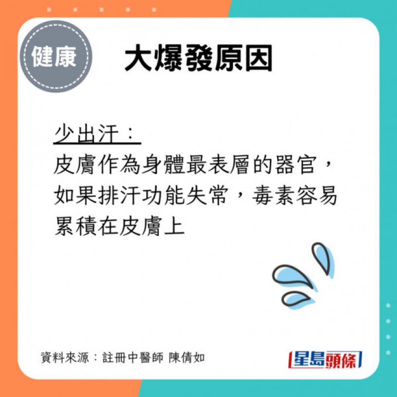 另外,女病人也有排汗問題,少出汗不一定好?陳倩如醫師指,身體排毒的途徑主要是排汗和大小便,女性則還有月經。任何一個通道閉塞,例如難出汗、便祕、閉經等情況,都會影響身體排出毒素。尤其是皮膚作為身體最表層的器官,如果排汗功能失常,毒素容易累積在皮膚上,出現濕疹、痤瘡等疾病。