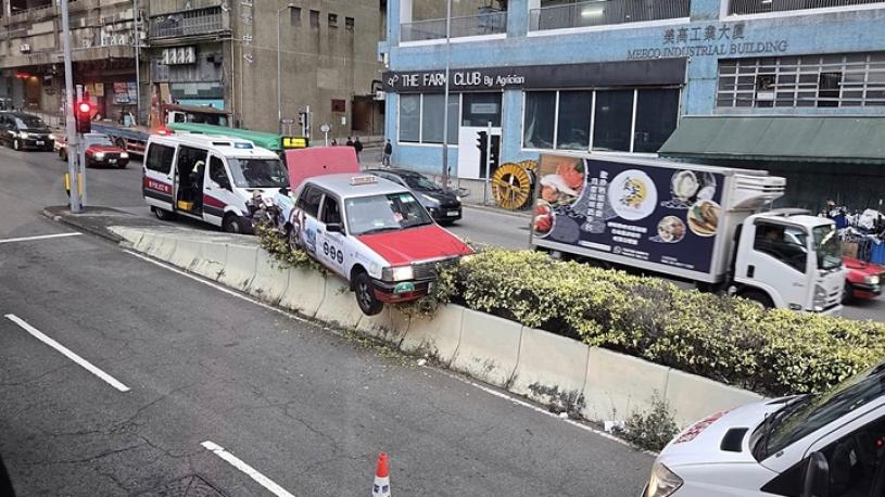 的士失控剷上花槽。fb:車cam L(香港群組)