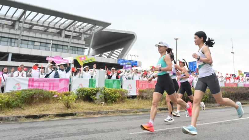 女子組參賽選手跑經深圳灣口岸,打氣隊伍在旁為運動員打氣。