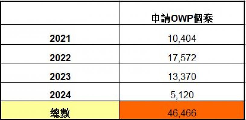在申请开放式工签(OWP)方面,从2021年2月起至2024年12月期间,合共有46,466人申请OWP。当中2022年申请人数最多,其后每年下跌。
