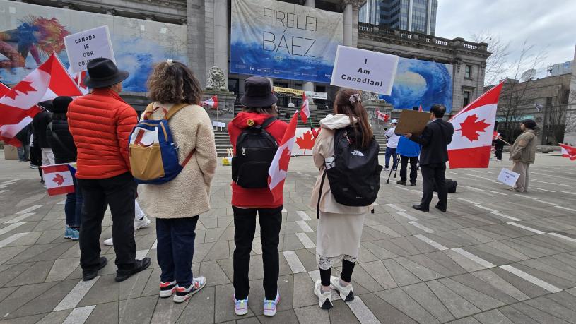 星期日下午的溫哥華美術館廣場上一片紅白色彩,加拿大國旗在風中搖曳,大約 100 多人共同表達支持加拿大、反對美國霸凌的心聲。