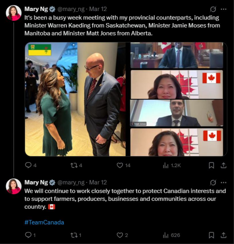 伍鳳儀本月13日於社交平台X上發文稱,將會繼績與各省同僚緊密合作,「保護加拿大的利益並支援全國的農民、生產者、企業和社區。 」