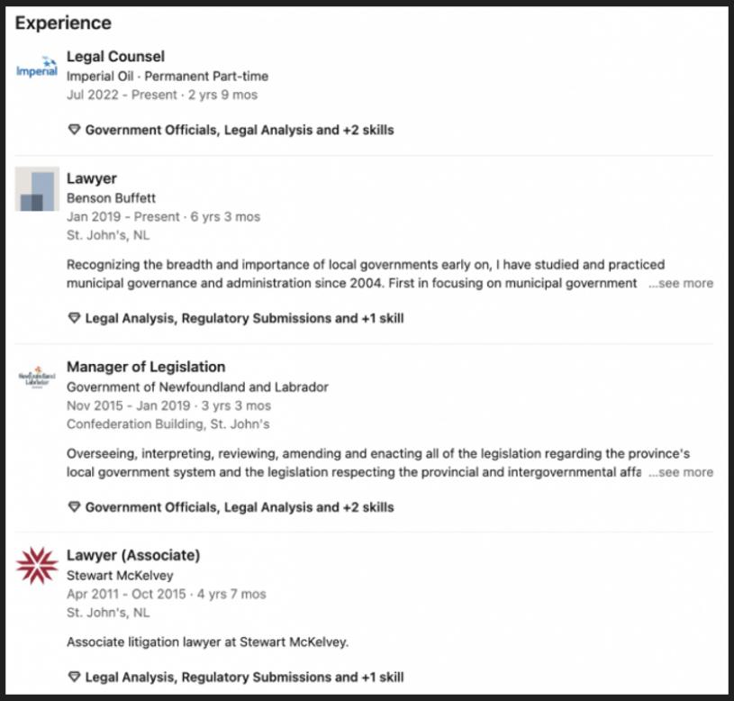 小編從領英上找到了這名女子的資料,顯示該女子居住在紐芬蘭,現在是帝國石油有限公司(Imperial Oil)的律師。2015年至2019年期間曾任紐芬蘭和拉布拉多政府的法律事務經理。