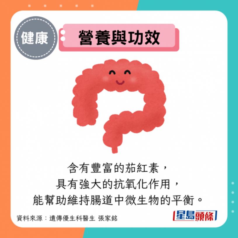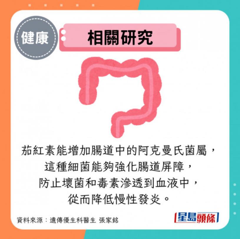 有科學家發現,茄紅素能夠增加腸道中的阿克曼氏菌屬(Akkermansia),這種細菌能夠強化腸道屏障,防止壞菌和毒素滲透到血液中,從而降低慢性發炎。此外,阿克曼氏菌屬數量較多的人,通常體脂肪較少,代謝也較好。