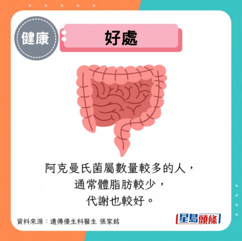 遺傳優生科醫生張家銘在其facebook專頁指出,腸道就像一座代謝工廠,有數兆個微生物,負責幫助消化和吸收營養,而影響體重、血糖和脂肪囤積,甚至有損肝臟健康,誘發脂肪肝。若腸道中擁有足夠的好菌,身體就會順利地進行代謝,而能量利用效率高,就不容易肥胖。相反,如果壞菌過多,腸道屏障就會變差,讓脂多醣等有害物質滲透進血液,引發慢性發炎。當脂肪越囤越多,可能會增加患上脂肪肝的風險。