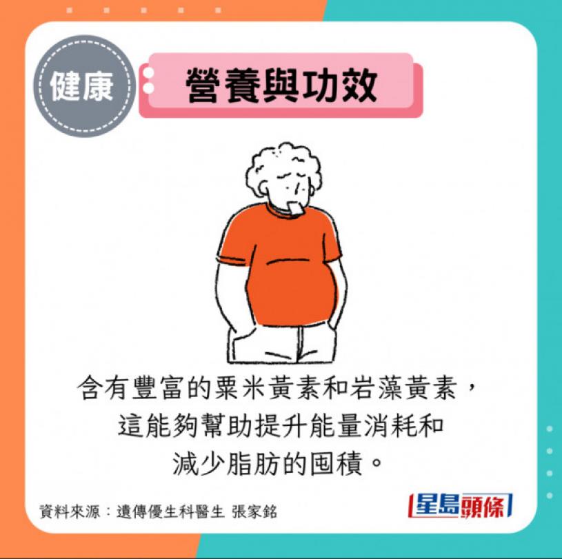 黃色食物中的南瓜、粟米、木瓜和海藻類,含有豐富的粟米黃素和岩藻黃素。這些營養素能夠幫助提升能量消耗和減少脂肪的囤積,降低出現脂肪肝的風險。