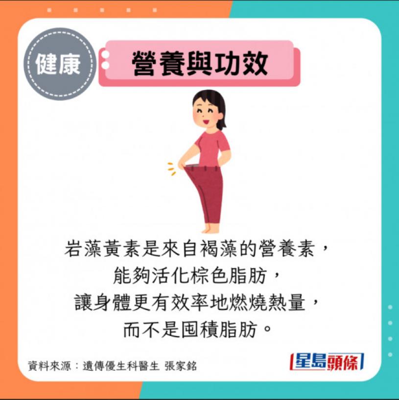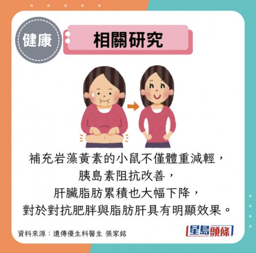 岩藻黃素是來自褐藻的營養素,能夠活化棕色脂肪,讓身體更有效率地燃燒熱量,而不是囤積脂肪。它還能改變腸道菌群,增加Bacteroidetes(與瘦身相關的菌種),減少Firmicutes(與肥胖相關的菌種)。有動物實驗顯示,補充岩藻黃素的小鼠不僅體重減輕,胰島素阻抗改善,肝臟脂肪累積也大幅下降。這表明岩藻黃素對於對抗肥胖與脂肪肝具有明顯效果。