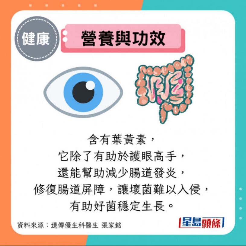 例如菠菜、西蘭花和牛油果,含有葉黃素,它除了有助護眼外,還能減少腸道發炎,修復腸道屏障,讓壞菌難以入侵腸道,有助好菌穩定生長。