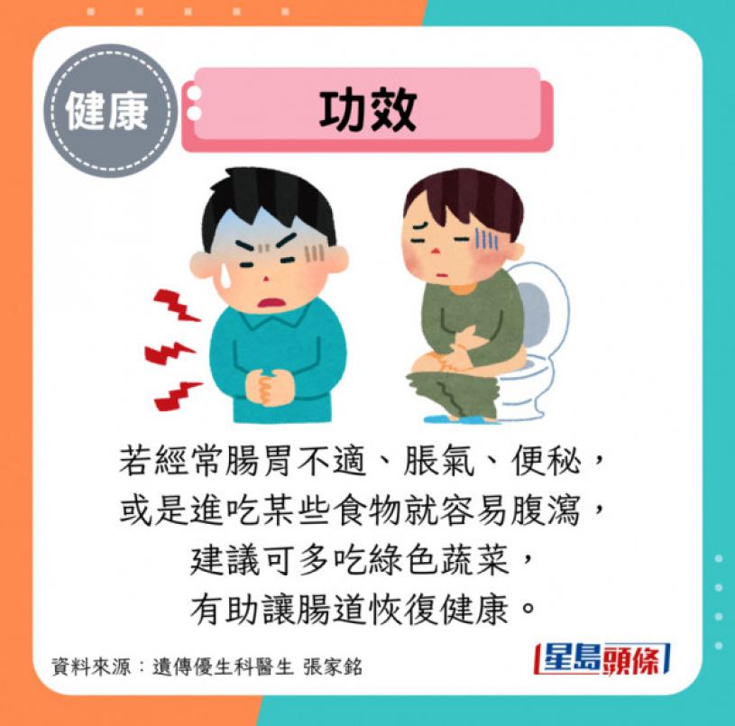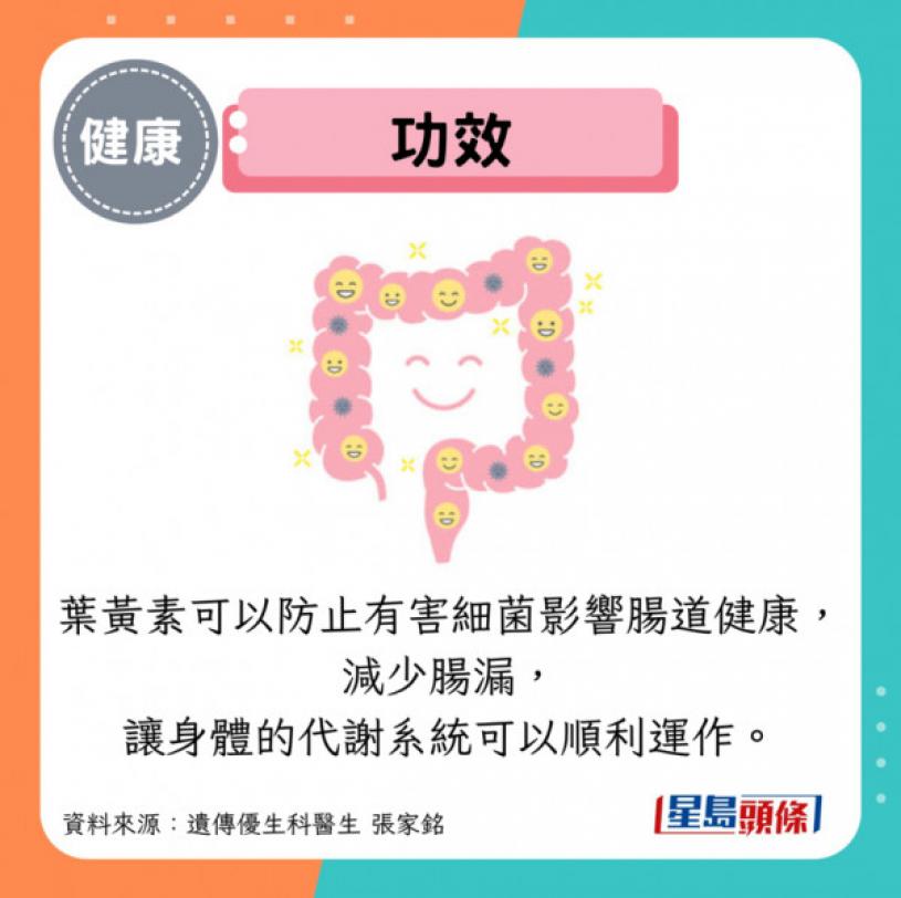 此外,葉黃素可以防止有害細菌影響腸道健康,減少腸漏,讓身體的代謝系統可以順利運作。若經常腸胃不適、脹氣、便秘,或是進吃某些食物就容易腹瀉,建議可多吃綠色蔬菜,有助讓腸道恢復健康。