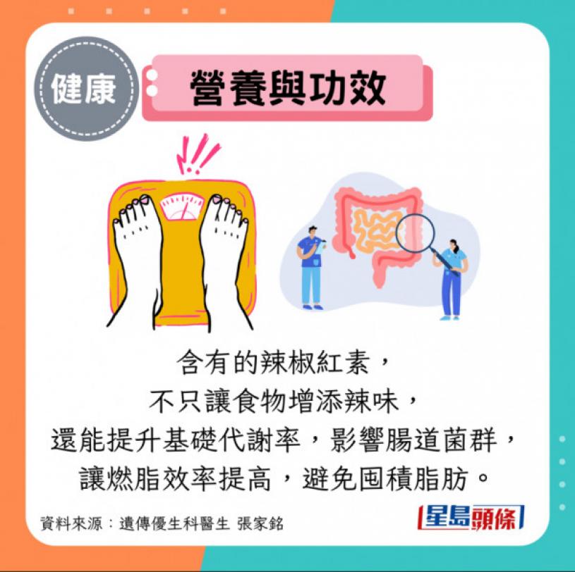 紅辣椒含有的辣椒紅素,不只讓食物增添辣味,還能提升基礎代謝率,影響腸道菌群,讓燃脂效率提高,避免囤積脂肪。