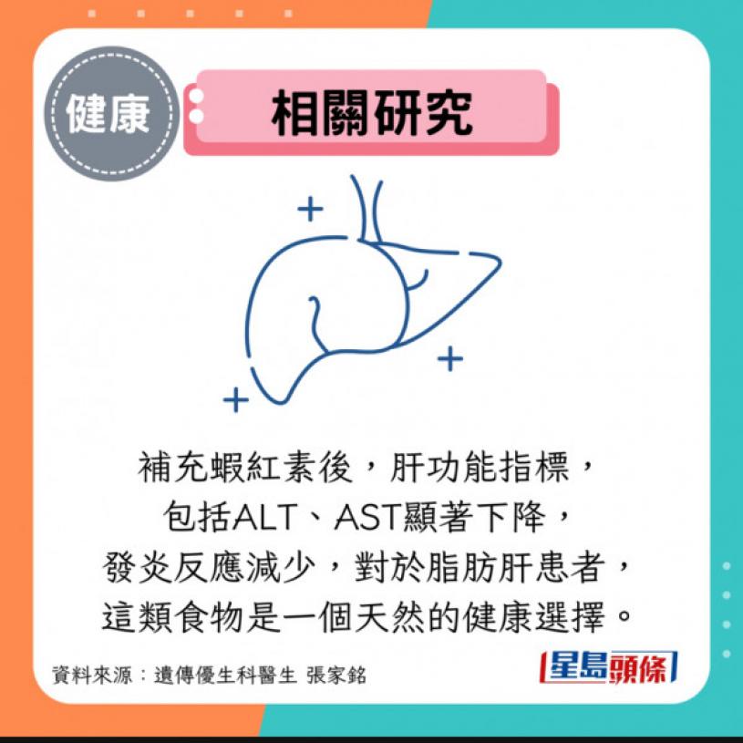 此外,蝦、蟹、三文魚和紅藻蝦紅素,則是超強的抗氧化劑,能避免患上脂肪肝,減少發炎並調整腸道菌群,幫助肝臟排毒與脂肪代謝。有研究指出,補充蝦紅素後,肝功能指標,包括ALT、AST顯著下降,發炎反應減少,對於脂肪肝患者,這類食物是一個天然的健康選擇。