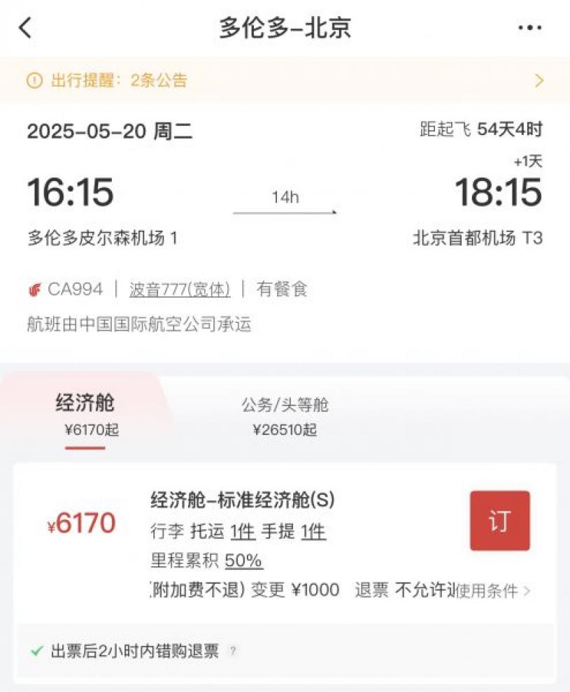 自5月20日起,中国国际航空公司正式开通每周两班的北京一多伦多航线,逢每周二、六飞,国航APP现在已经开始售票。