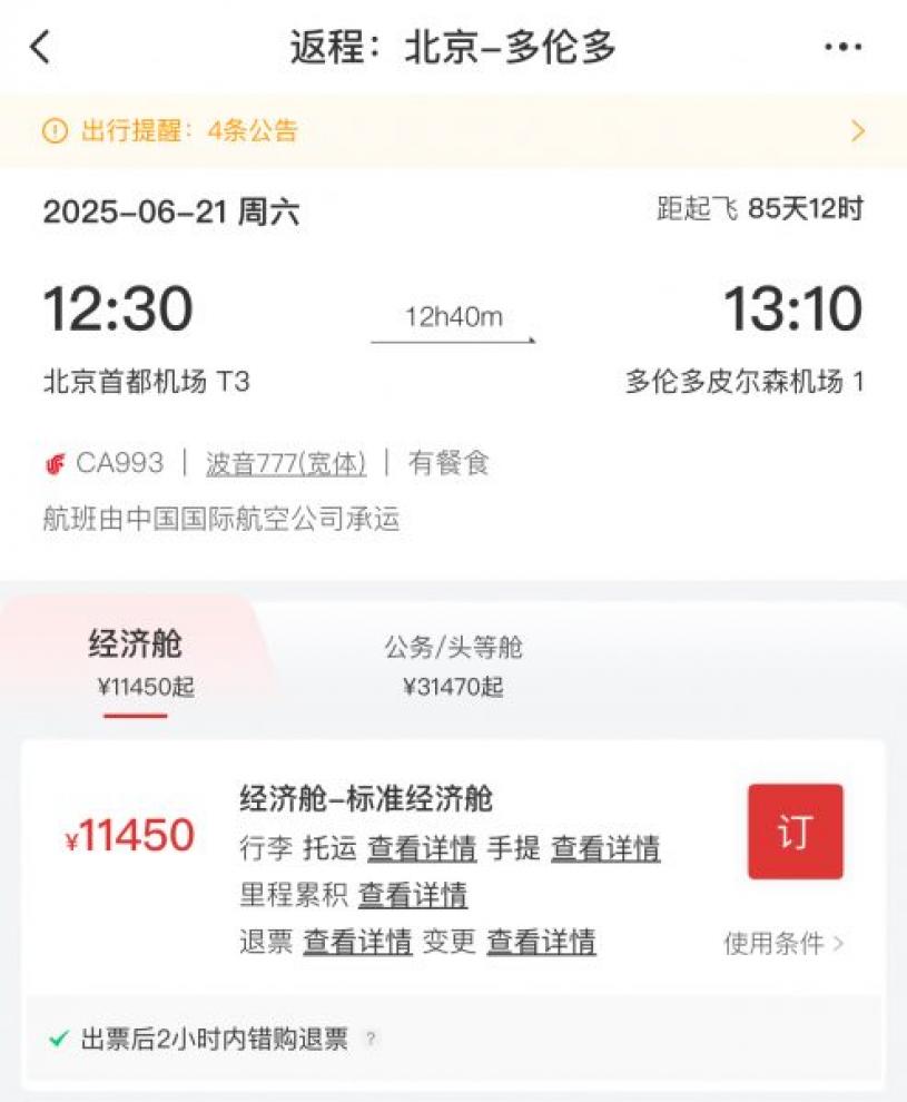 航班号:CA993 航线:北京首都-多伦多 航班时刻:12.30-13.10