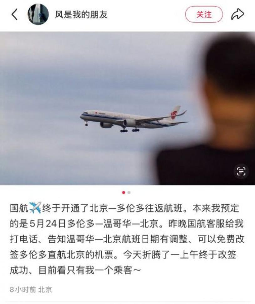 有网友昨晚表示“本来我预定的是5月24日多伦多-温哥华-北京。昨晚国航客服给我打电话,告知温哥华-北京航班日期有调整、可以免费改签多伦多直航北京的机票。今天折腾了一上午终于改签成功、目前看只有我一个乘客~”