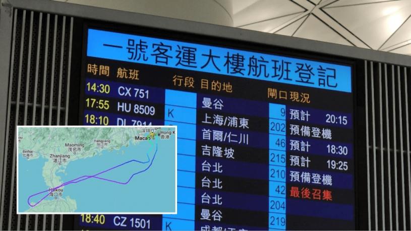 據航空追蹤網站Filghtradar24顯示,今日下午2時46分出發由香港飛曼谷的國泰CX751航班,至海南島上空後,便180度轉向折返香港。