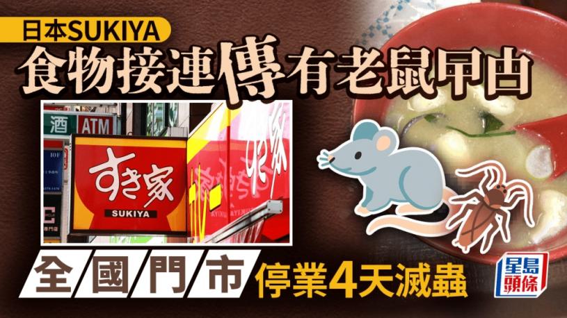 日本最大牛丼連鎖品牌「すき家」(SUKIYA)食物再出事!繼上周爆出鳥取縣門市早在今年1月曾向顧客提供「死老鼠味噌湯」,拖延2個月才道歉,東京一間門市周五(28日)接獲消費者反映菜餚有蟑螂。