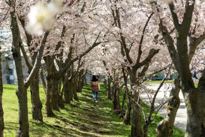 除了在这个 St. George 校园区,事实上鲜为人知的是其士嘉堡分校同样植有 50 棵樱花树(The Sakura Grove),位于人文翼和社会科学大楼。如今赏樱活动已成为每年一度的校园焦点,在感受高等学府的浓厚学术氛围的同时,不妨在樱花绽放的美景中,留下浪漫而美好的回忆。
