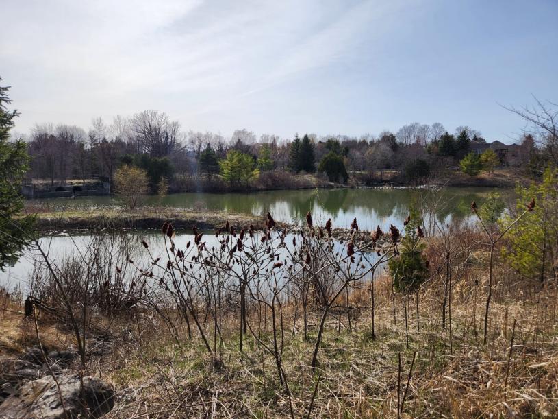 才刚步入公园,旁边就是一个不大不小的池塘。比起我曾造访过的几个万锦市公园,这公园的池塘面积可称得上是微型,不过于我而言,水是公园不可或缺的其中一部分,哪怕只是一条狭窄的河流、一潭寂静的湖水,都能带来一股莫名的淡然。池塘中央有一道从塘边延伸而出的土墩,走在上面没错是能身处于池水中央,但当然是不鼓励这样做啦,毕竟没有栏杆之类的保护措施。