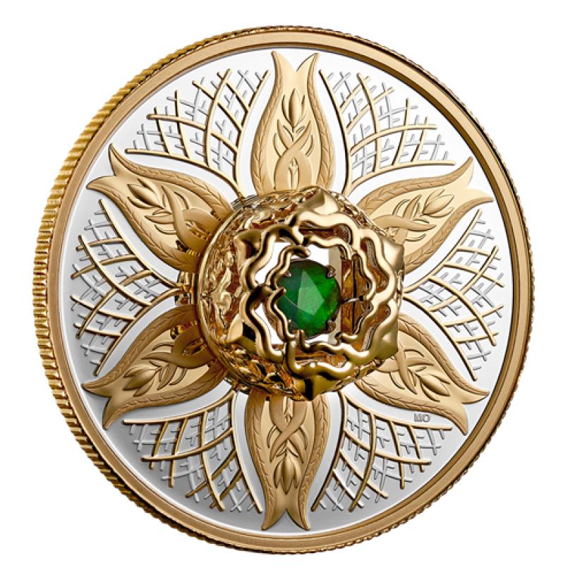硬币背面由插画家Mariya Olshevska设计,以99.9%纯银和镀金黄金打造,饰有精致的花卉图案,硬币中央镶嵌著珠宝托座,使其呈现出立体效果,内部则镶嵌著一颗闪闪发光的斑彩石宝石。