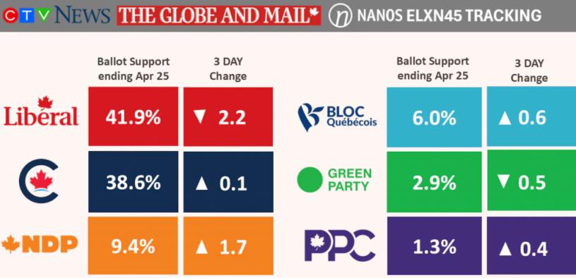 CTV报道,民调机构Nanos Research于4月23日至25日进行的为期三天滚动抽样调查结果显示,自由党在全国范围内的支持率为42%,而保守党的支持率为39%。