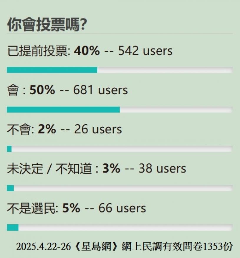 有高達50%受訪者表示會在選舉日投票,另有40%已於復活節長周末提前投票,反映整體投票意欲非常踴躍。