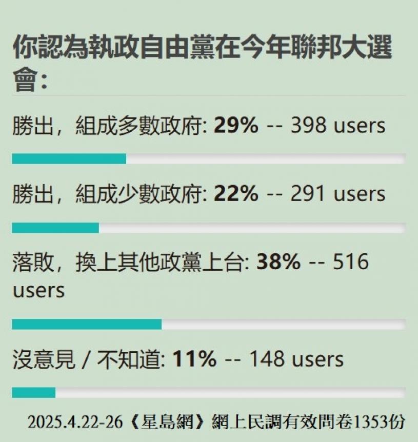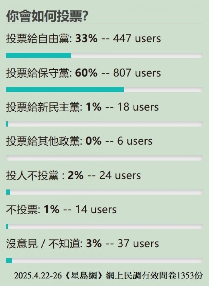 加拿大星島新聞網於4月22至26日,就大選投票取向再度進行網上民調,共收回了1,353份有效問卷。結果如下: