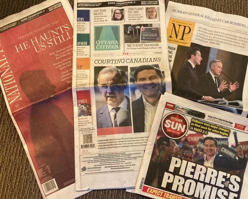 然而,走进当地的便利店,可见当地的地区媒体各有不同取态。例如《Ottawa Citizen》的报章头版故事,并列卡尼、博励治的选情;《Ottawa Sun》作为小报形式,以支持博励治当选的立场作为封面。