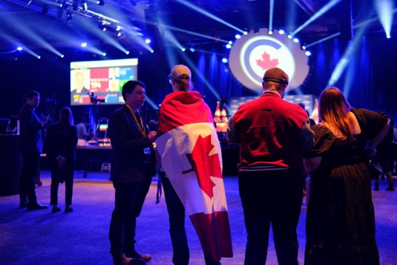 保守党党领博励治的“选情之夜”在渥太华市中心Rogers Centre晚上9时举行。星岛记者在现场所见,晚上10时许,有近300位支持者,部分人穿上写有“Canada First”和“Pierre Poilievre for Prime Minister”的深蓝T恤,并在现场欢呼喝采,以支持获得席位的保守党。