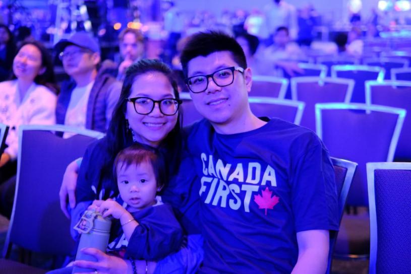 在本地出生的加拿大华裔Robert与太太Lina(下图),携同幼女到现场支持保守党。Robert表示,过去他30多年来,支持保守党;目前在自由党执政下,他面对物价、房价涨升等问题,致使他和太太无法负担买起新房屋;Lina补充,自由党亦有“审查言论”(To censor our speech),相对之下她支持保守党的“自论自由”。