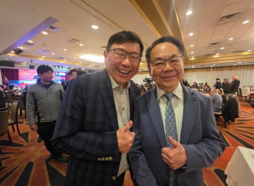 前保守党国会议员赵锦荣(Kenny Chiu)(左)到场为区泽光(Chak Au)(右)打气 (星岛记者陈仪芬摄)