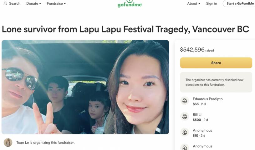 温哥华Lapu Palu菲律宾节日活动发生的汽车撞人惨剧,有一名青少年的父母和5岁妹妹不幸身亡,成为孤儿的他获得许多人在GoFundMe为其捐款,他感谢各界的帮助,并允诺捐出 26.6 万元给其他受害家庭...... 点击看详细内容