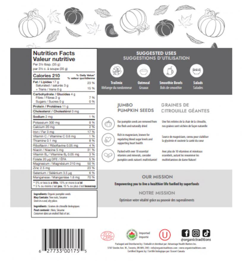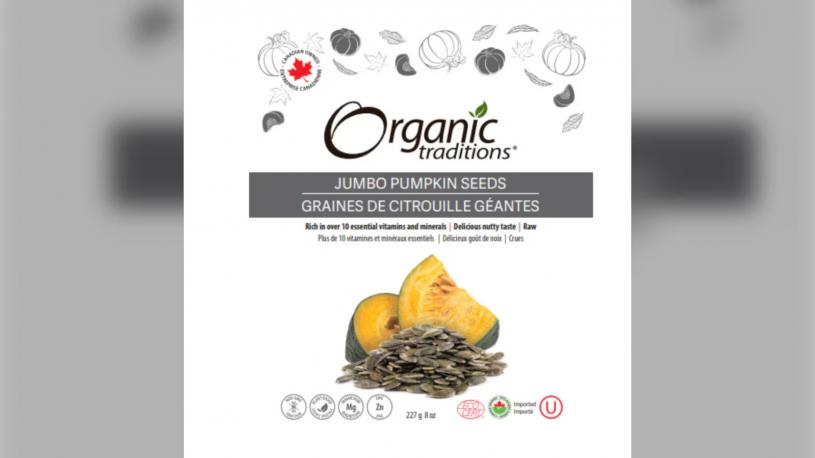【星岛综合报道】加拿大食品检验局(CFIA)表示,Organic Traditions 品牌的南瓜籽受沙门氏菌污染风险,已在全国召回。