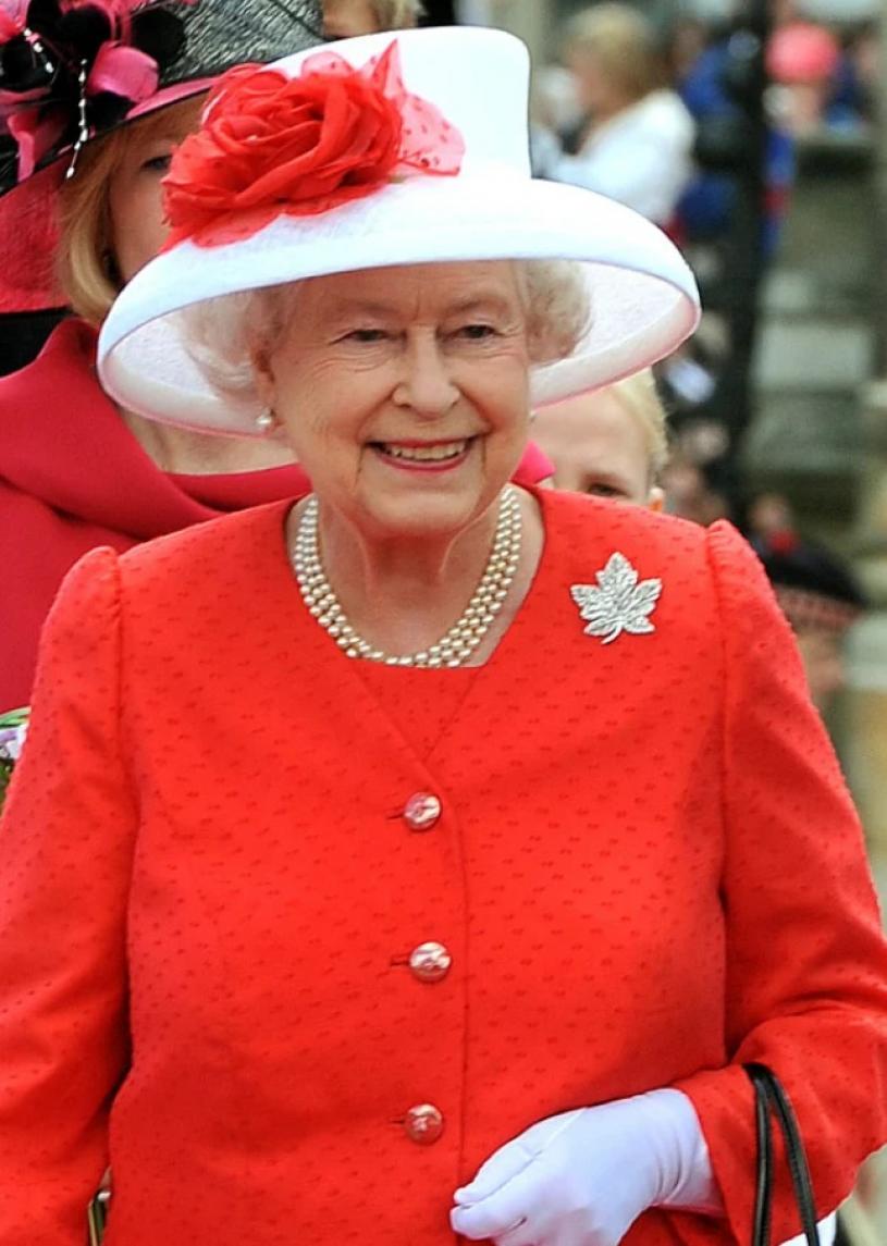 已故女王伊利沙伯二世佩戴楓葉胸針。由Asprey & Co製造,鑲有鑽石及鉑金