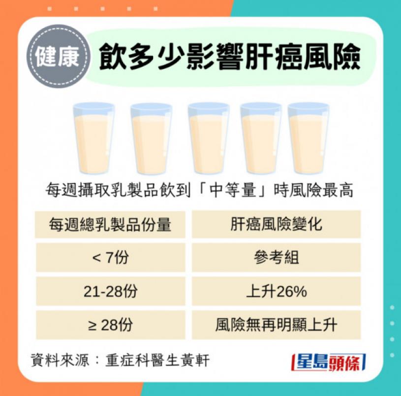 黃醫生指,研究結果顯示,每周攝取乳製品飲到「中等量」時風險最高,再多反而趨於平穩。