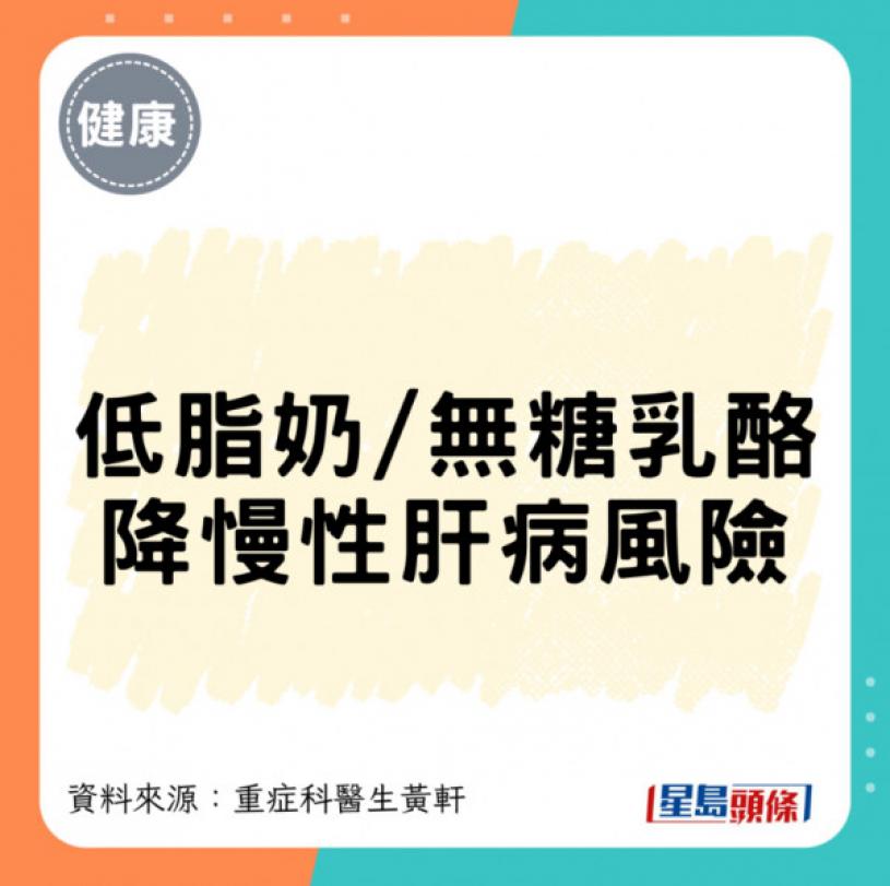 研究團隊指,低脂乳製品及乳酪都有保護作用,乳酪還含益生菌,有益腸道健康、護免疫系統。每周攝取低脂奶/無糖乳酪可降慢性肝病死亡風險: