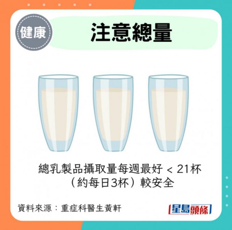 ·注意總量:總乳製品攝取量每週最好 < 21杯(約每日3杯)較安全。