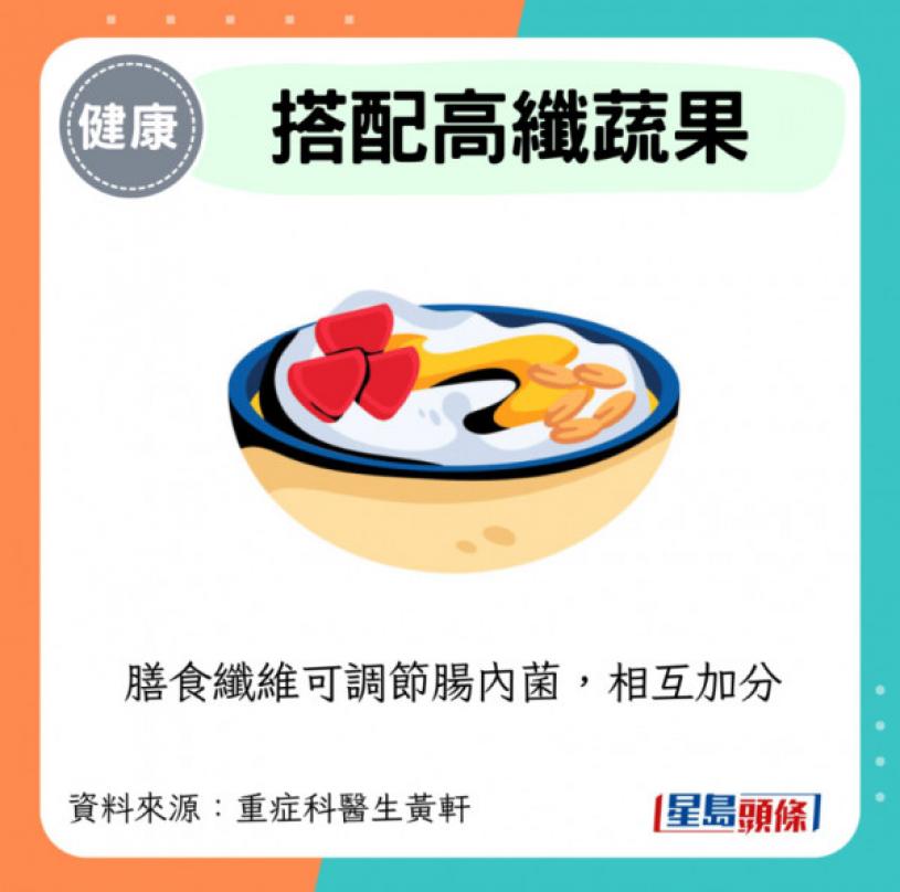 ·搭配高纖蔬果:膳食纖維可調節腸內菌,相互加分。