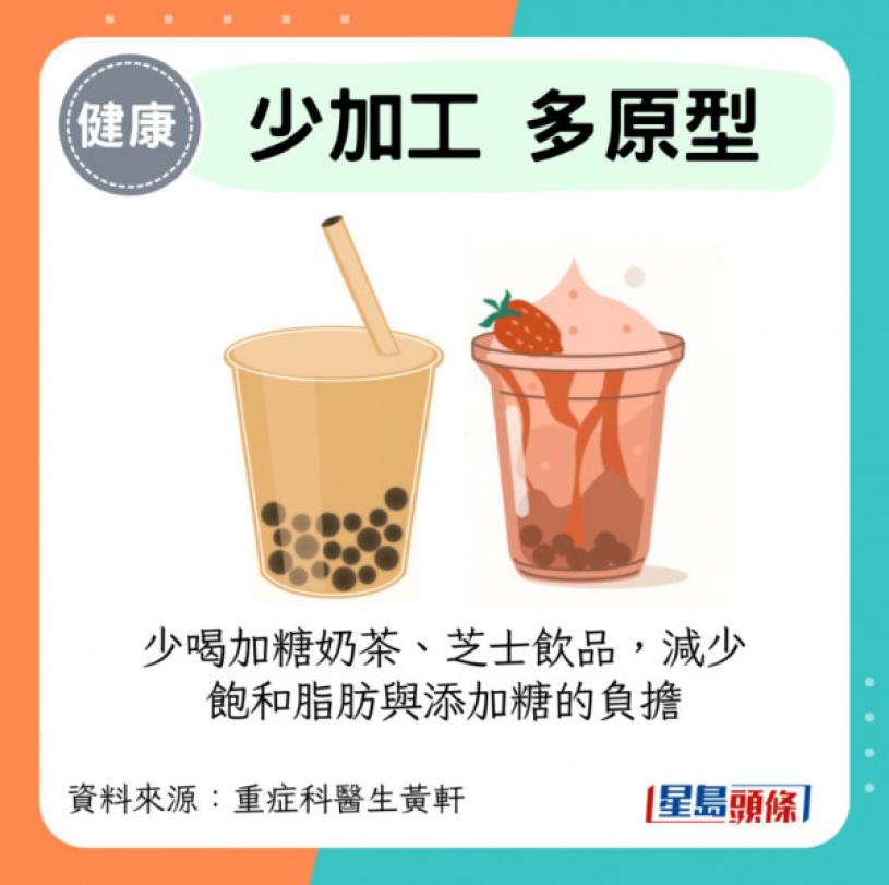 ·少加工多原型:少喝加糖奶茶、芝士飲品,減少飽和脂肪與添加糖的負擔。