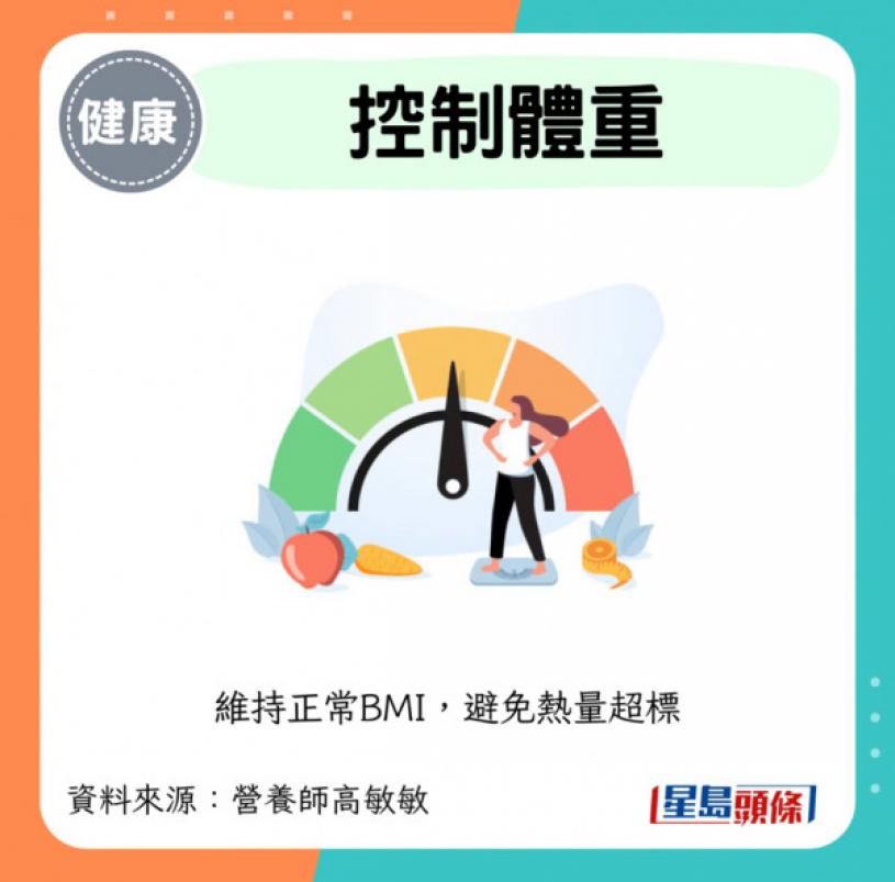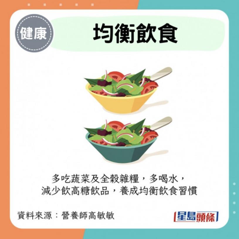 多吃蔬菜及全穀雜糧,多喝水,減少飲高糖飲品,養成均衡飲食習慣。