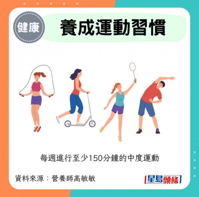 每週進行至少150分鐘的中度運動;或維持每周運動3次,每次30分鐘,心跳每分鐘達130下。