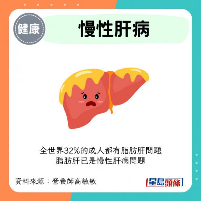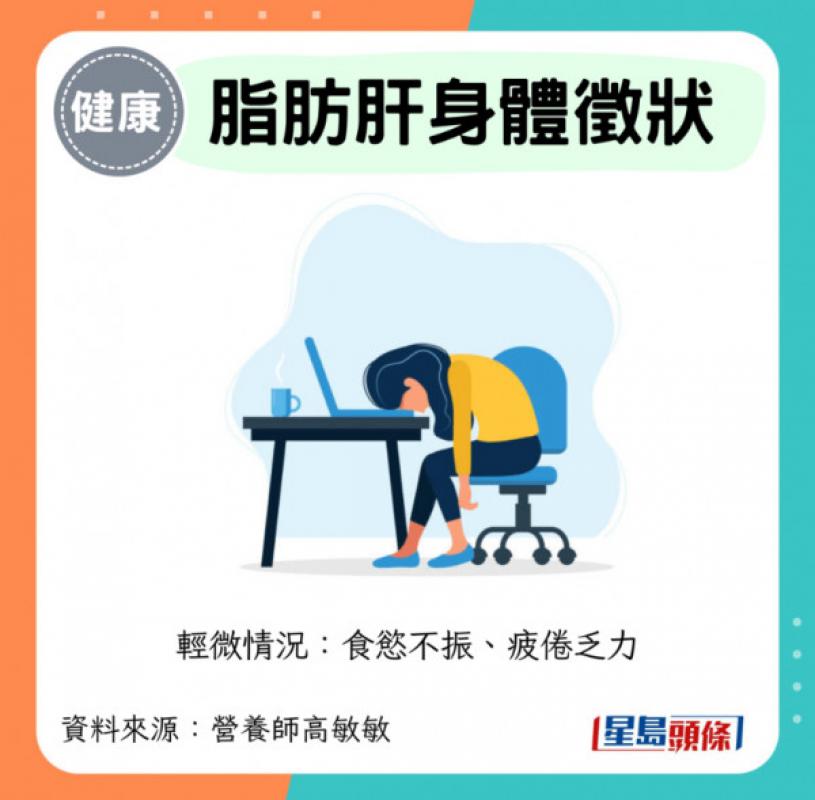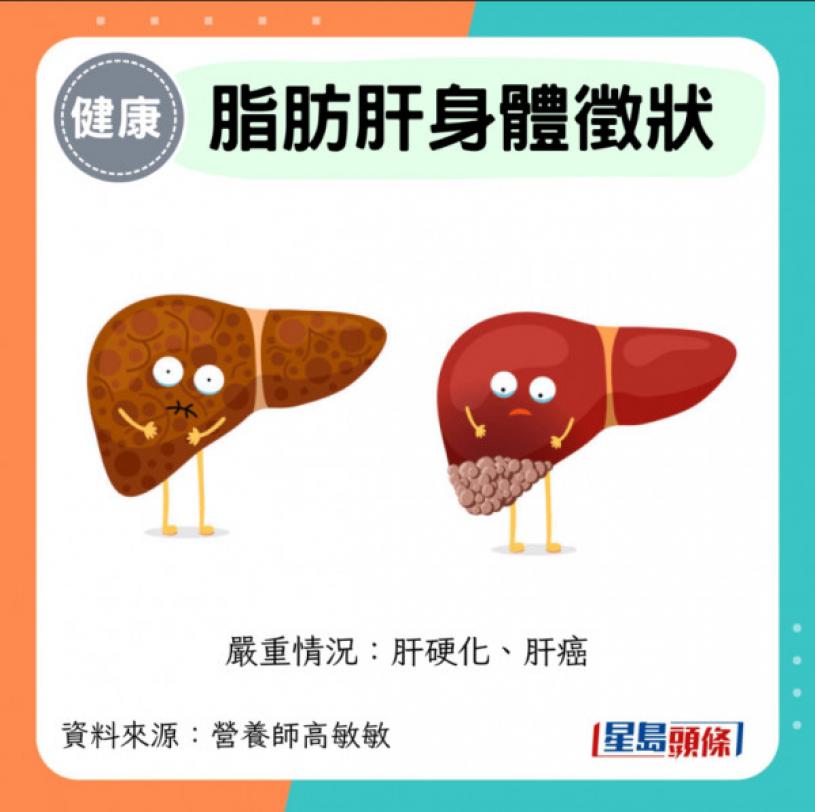 營養師高敏敏在個人Facebook專頁分享,全世界32%的成人都有脂肪肝問題,脂肪肝已是慢性肝病問題。很多人誤會只有胖子才會患脂肪肝,實際上很多體型正常或偏瘦者同樣會中招,一照超聲波才發現肝臟脂肪堆積過多。高敏敏指,如果肝臟開始發胖、出現脂肪肝,會引起肝臟發炎,影響器官正常功能,輕微時可能會出現食慾不振、疲倦乏力,嚴重更會導致肝硬化或肝癌。