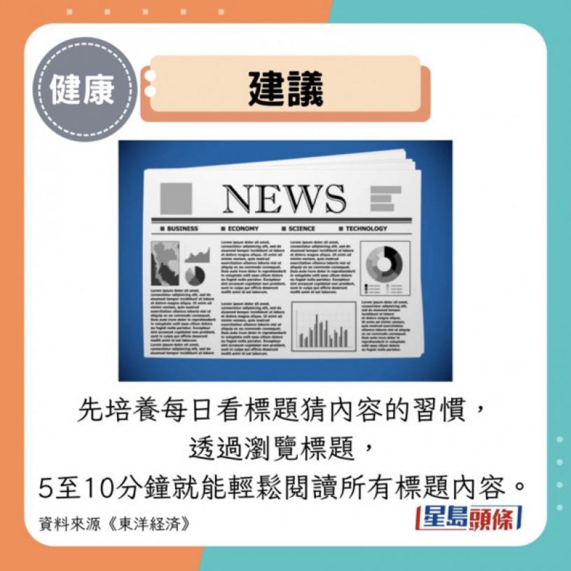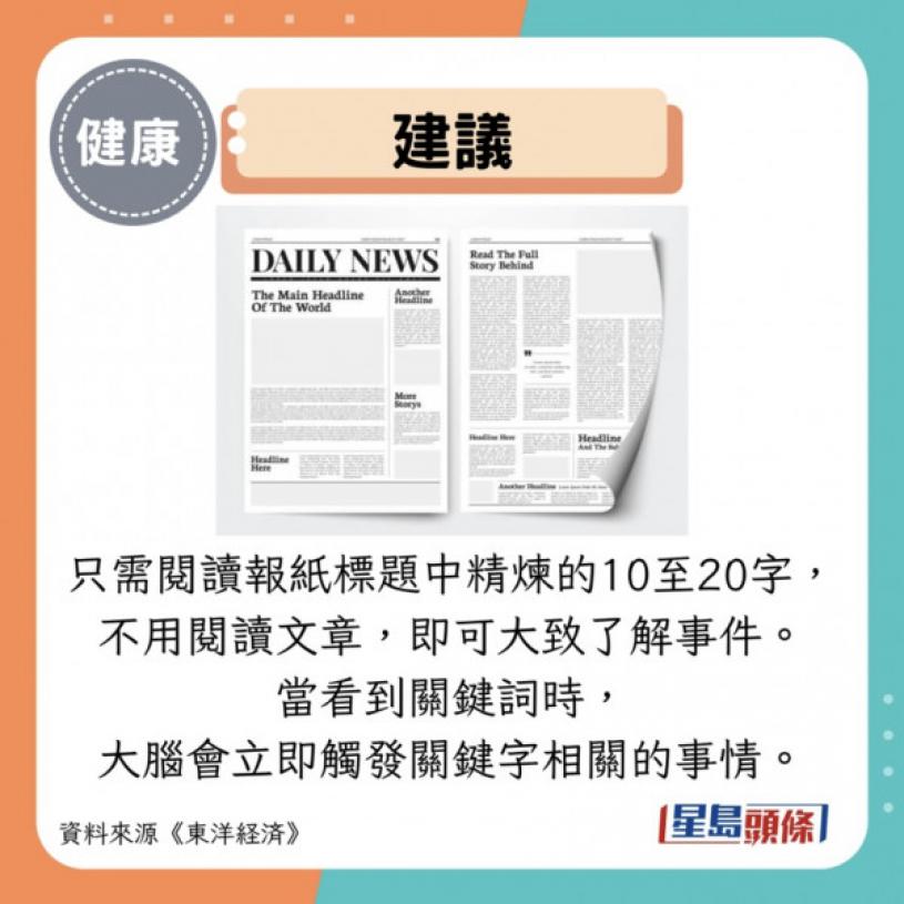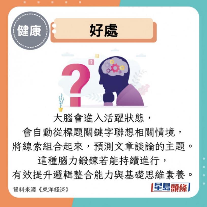 只需閱讀報紙標題中精煉的10至20字,不用閱讀文章,即可大致了解事件。當看到「出口國」、「緊張」等關鍵詞時,大腦會立即觸發關鍵字相關的事情。在嘗試從新聞標題推測文章內容時,大腦會進入活躍狀態,會自動從標題關鍵字聯想相關情境,像拼圖將線索組合起來,預測文章可能談論的主題。這種腦力鍛煉若能持續進行,將有效提升邏輯整合能力與基礎思維素養。