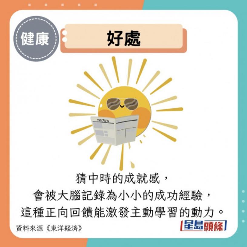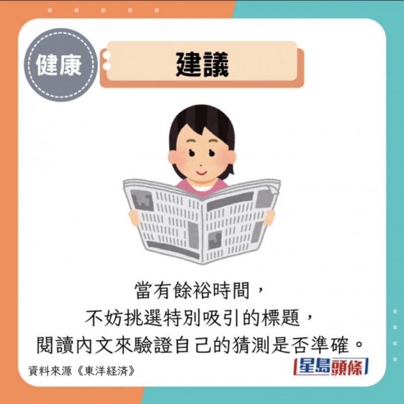 石川久醫生表示,建議先培養每日看標題猜內容的習慣,透過瀏覽標題,5至10分鐘就能輕鬆閱讀報紙所有標題內容。當有餘裕時間,不妨挑選特別吸引的標題,閱讀內文來驗證自己的猜測是否準確。猜中時的成就感,會被大腦記錄為小小的成功經驗,這種正向回饋能自然激發主動學習的動力。標題聯想練習就像日常腦力遊戲,每天可進行多次,關鍵在於保持輕鬆愉快的心情進行這個思考過程。