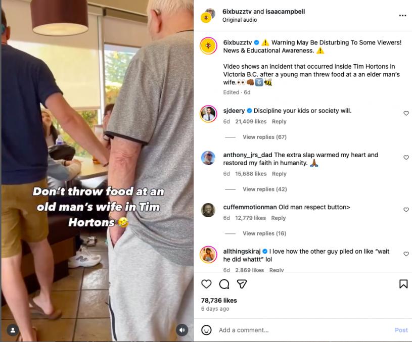 这段摄于4月27日发生在峡谷路(Ravine Way)3501号Tim Hortons的事件,几天之内已被观看超过1,600万次,并且评论都一面倒力挺老伯给这名少年上一堂“老派礼仪课”。