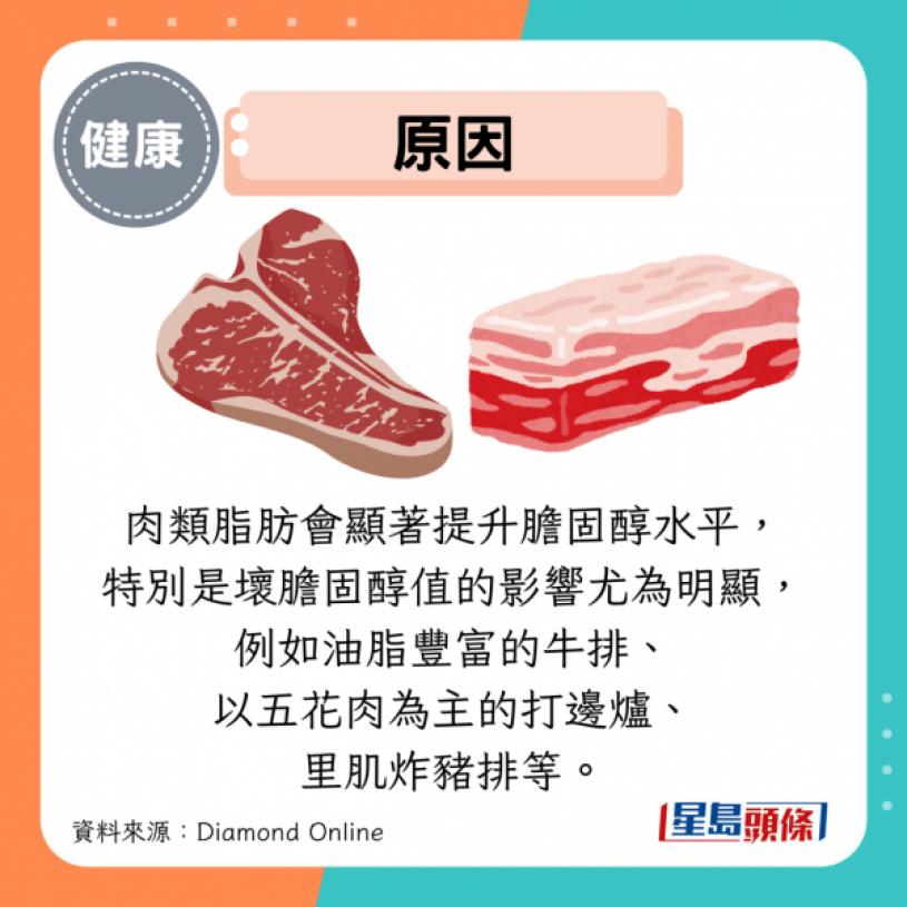 肉類脂肪例如油脂豐富的牛扒、以五花肉為主的鍋物、炸豬扒等,會顯著提升膽固醇水平,特別是對壞膽固醇值的影響尤為明顯。如果身體檢查結果顯示壞膽固醇值偏高,建議避免攝取這類高脂食物。